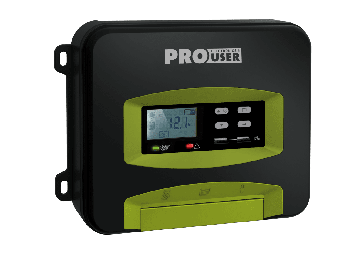 MPPT står för Maximum Power Point Tracking och är en teknik som säkerställer att en laddningsströmregulator skapar mer kraft från en solpanelsomriktare än när den inte innehåller MPPT-teknik. Denna teknik bestämmer den optimala driftpunkten så att maximal effekteffektivitet kan uppnås och omvandlar sedan detta till en lägre batterispänning. En MPPT laddningsströmregulator kan extrahera upp till 30% mer energi från en solpanel än en icke MPPT. En solpanels laddningsströmregulator behövs för att säkert ansluta en solpanel till ett batteri och tack vare hjälp av Pro-Users MPPT laddningsregulator erhålles högsta möjliga effektivitet/avkastning från solen. En laddningsregulator laddar ett batteri så effektivt som möjligt och skyddar det mot fluktuerande laddningsströmmar, men också mot djupurladdning. I det ögonblick batteriet riskerar att laddas ur för djupt kopplar styrenheten bort strömförbrukarna och skyddar därmed batteriet. • Lämplig för 12V / 24V batterier. • MPPT-teknik. • Skyddar batteriet mot fluktuerande laddningsströmmar och djupurladdning. • Bekväm LCD-indikator.